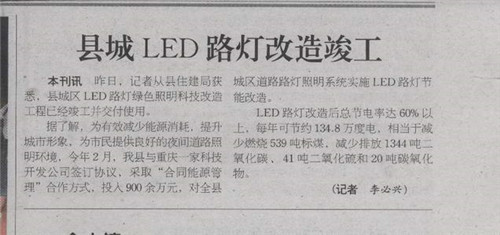 Kaiyang County County of Guizhou Province, our warm congratulations on the implementation of the transformation of the LED streetlight project completed ahead of time, and has delivered. May 27, 2013 in Kaiyang County in Guizhou province "today" reported Shenyang were reported, now reprinted as follows:
